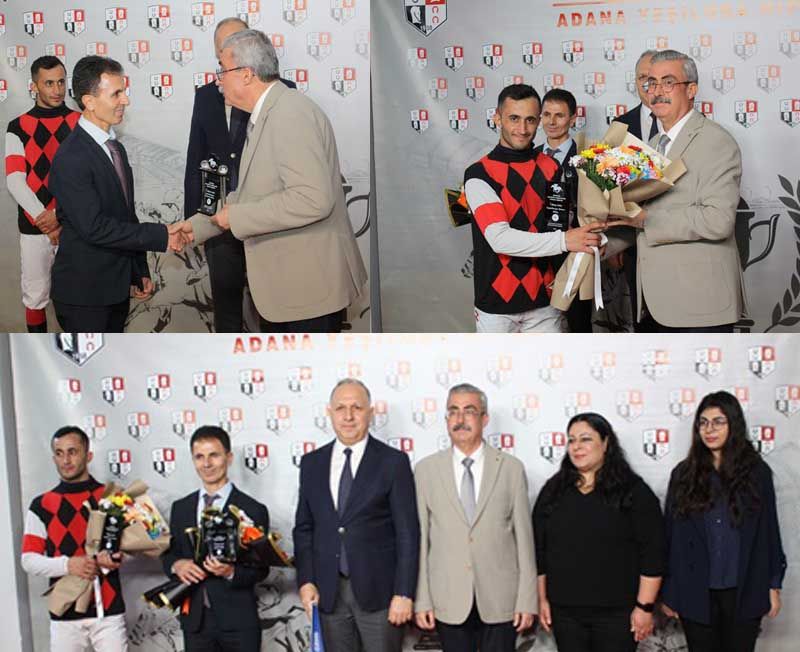 Ali Bedrettin Karataş ayrıca, koşuyu kazanan tayın jokeyi Hışman Çizik'e plaket ve çiçek verirken, Adana Hipodrom Müdürü Bora Güralp'e de günün anısına hediye verdi.