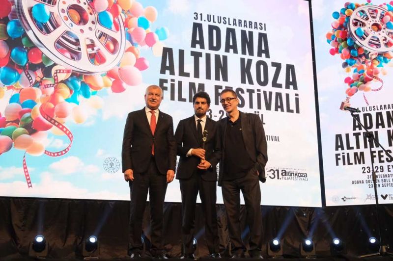 Yönetmen Fıratoğlu'na ödülünü Adana Büyükşehir Belediye Başkanı ve Festival Onursal Başkanı Zeydan Karalar ile Jüri Başkanı ünlü yönetmen Nuri Bilgi Ceylan birlikte verdi.